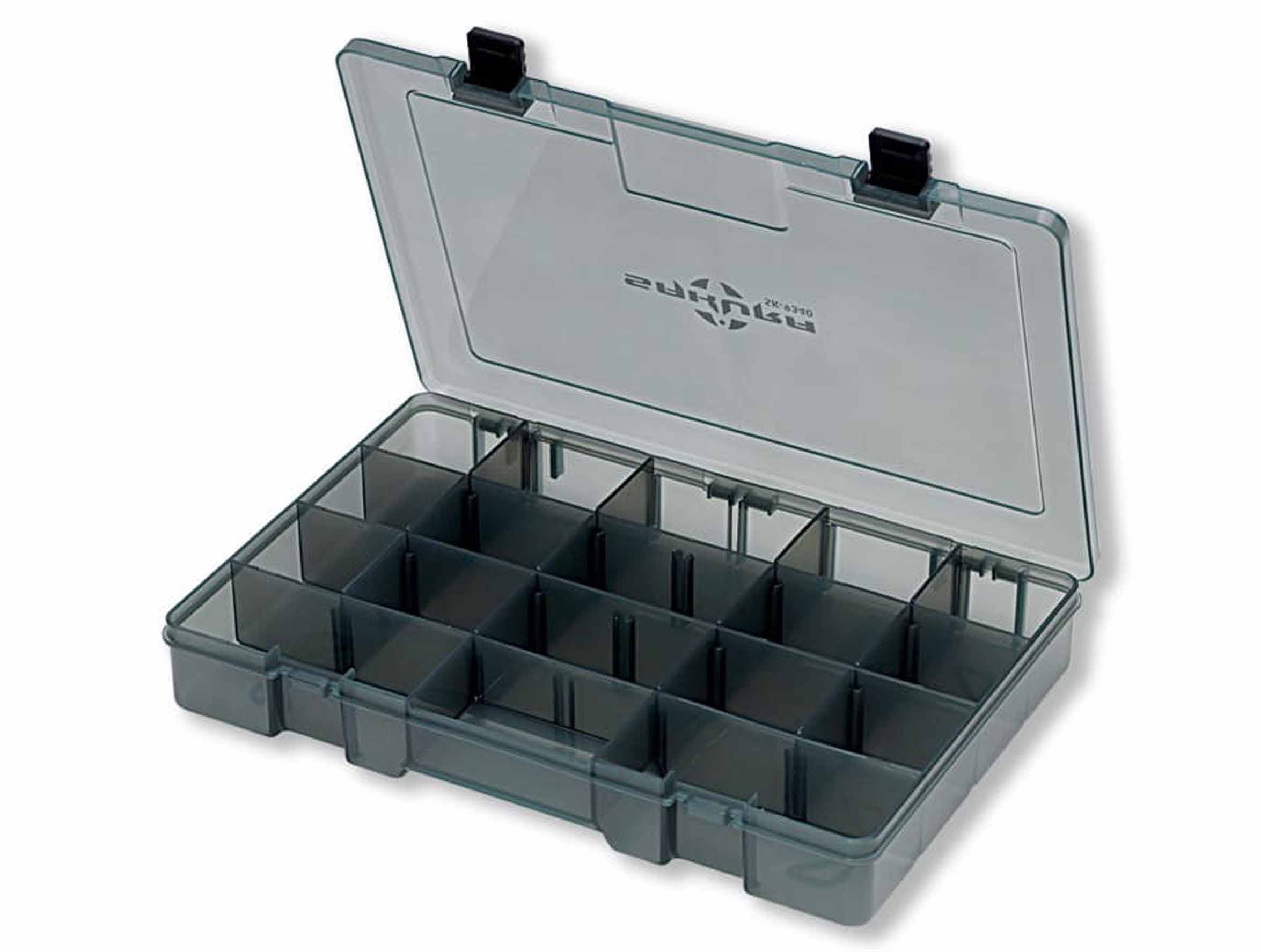 - Esta caja tiene unas dimensiones que le permiten acomodar señuelos grandes si retiramos los compartimentos de los 3 vanos largos.