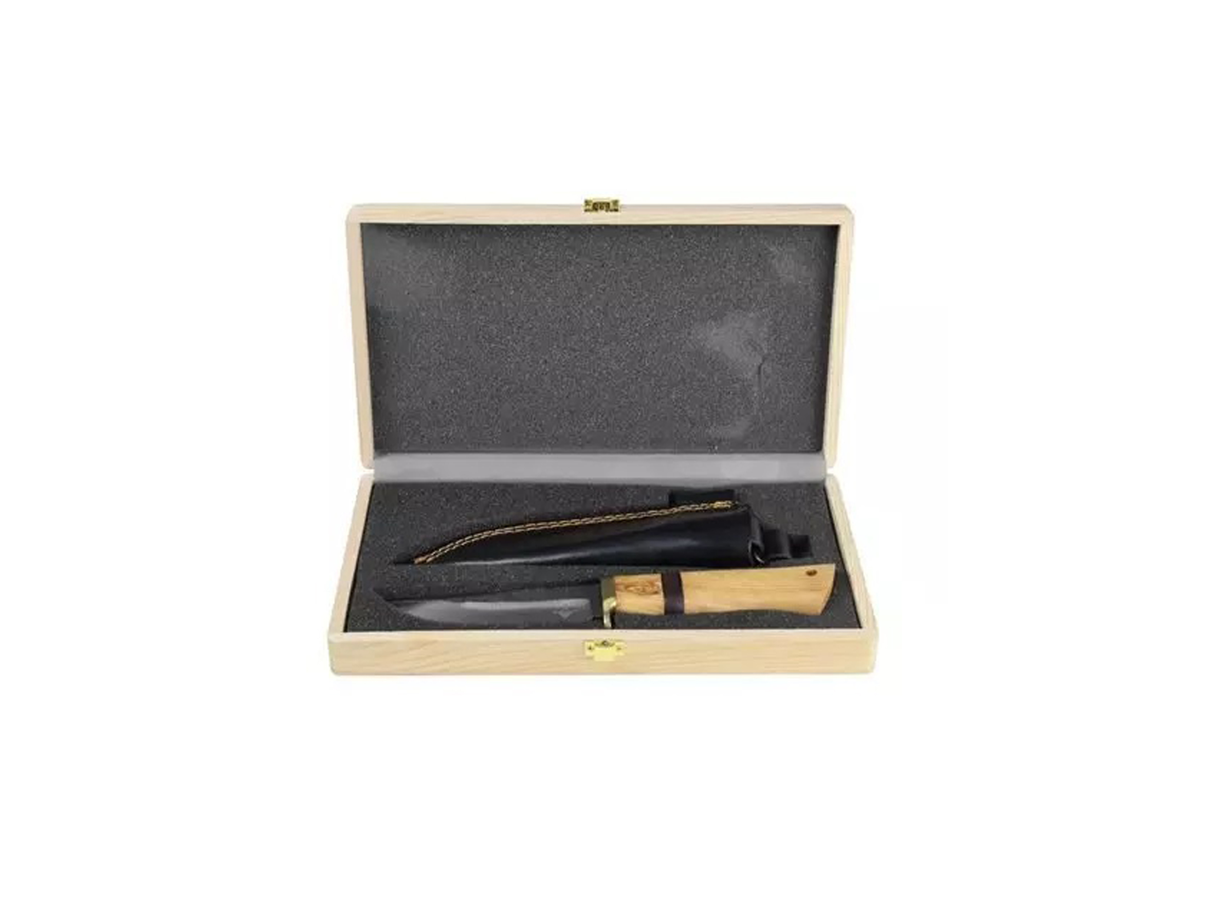 - El cuchillo Njord Bjorn incluye una caja de almacenamiento de madera y una funda de cuero negro hecha a mano con presilla para el cinturón.