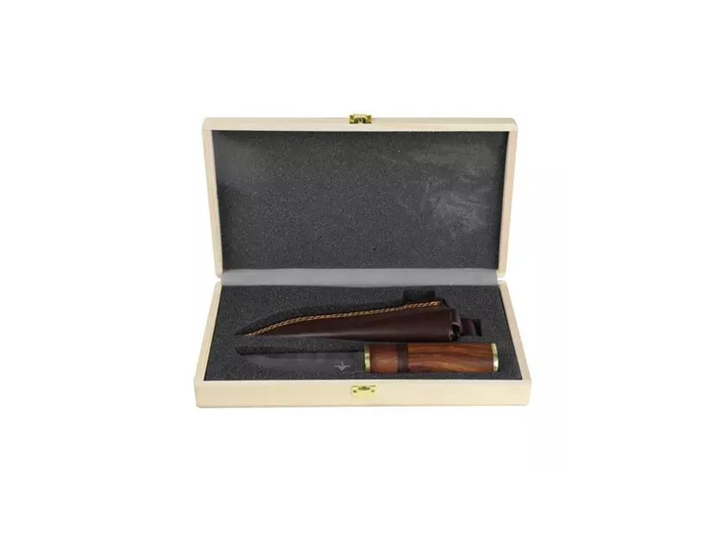 - Incluye una funda de cuero marrón hecha a mano con presilla para el cinturón y una caja de madera para su almacenamiento o regalo.