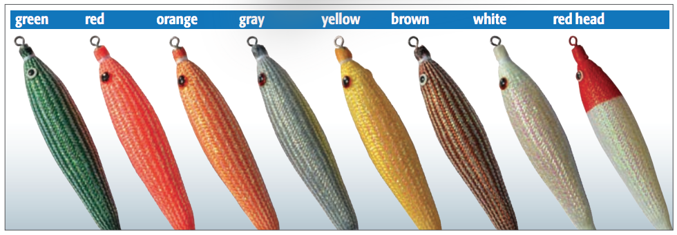 Este señuelo, gracias a la purpurina siliconada que posee emite destellos que hacen mucho más fácil e instintiva la captura del calamar.