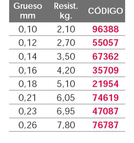 - También destacar de esta linea de pesca su resistencia a la abrasión, es un hilo que no se desgasta aunque se utilice en zonas de pesca con abundantes escollos.