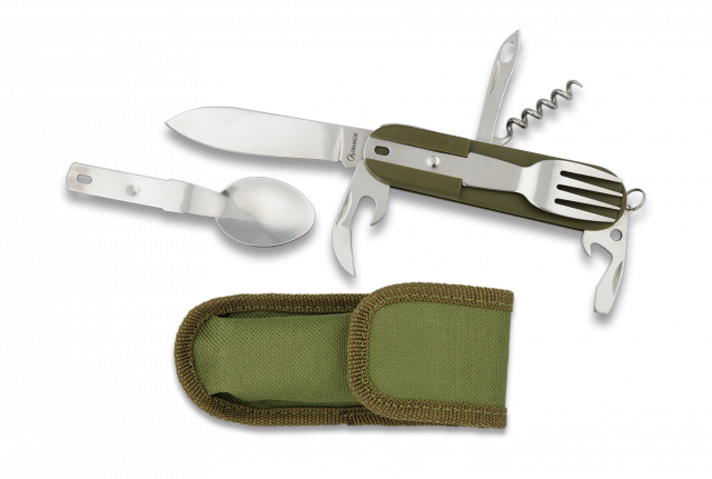 - Incluye: Tenedor, Cuchara, Cuchillo, Sacacorchos, Abridor, Aguja y Doblacables