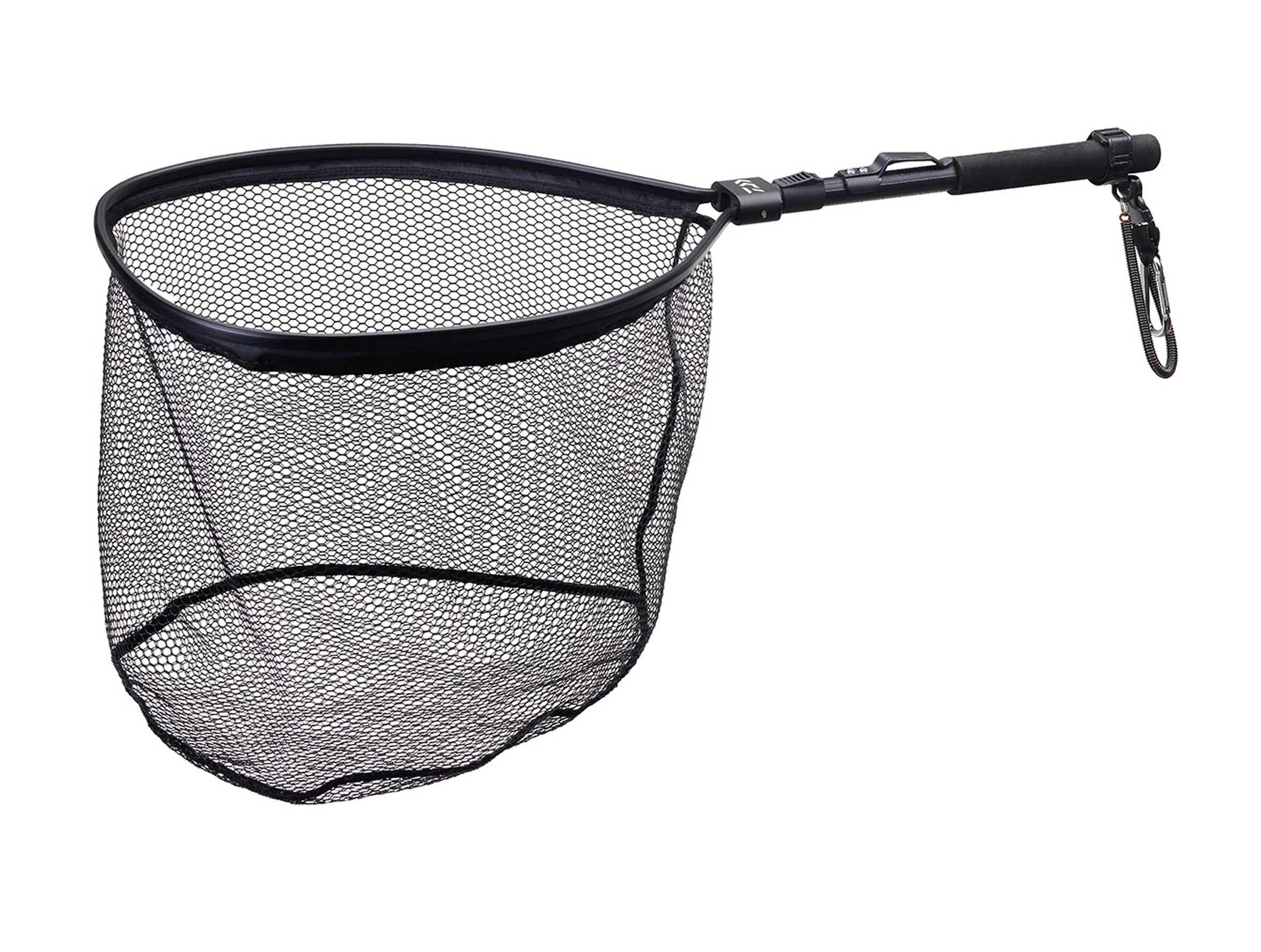- Al presionar el botón, se puede desplegar la cabeza ovalada de la red de aterrizaje para asegurar la captura de un hermoso salmónido.