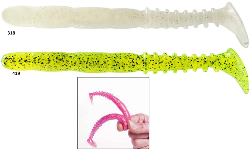 - No solo este pequeño shad tiene la distinción de tener una sección ovalada que le otorga ese particular balanceo similar al efecto que producen las cabezas tipo "scrounger", además las fuertes pulsaciones de alta frecuencia de su cola hace que imite perfectamente la natación de un alevín que hace que los depredadores no se puedan resistir.